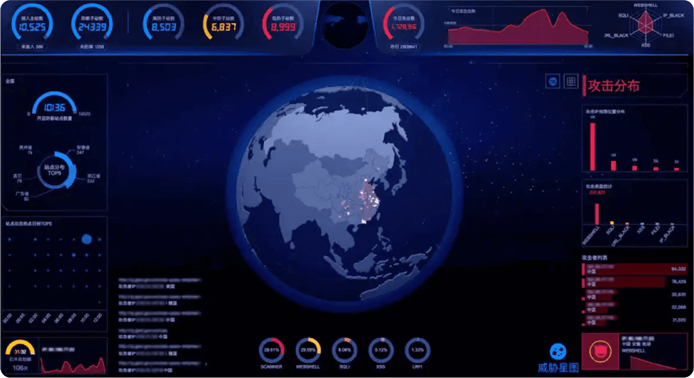 云防御态势感知指挥平台是知道创宇积累多年经验推出的大数据可视化威胁分析系统,侧重数据可视化,支持多级数据钻取,支持源数据多角度展示,做到"看得见、看得清",真正实现知己知彼,百战不殆。